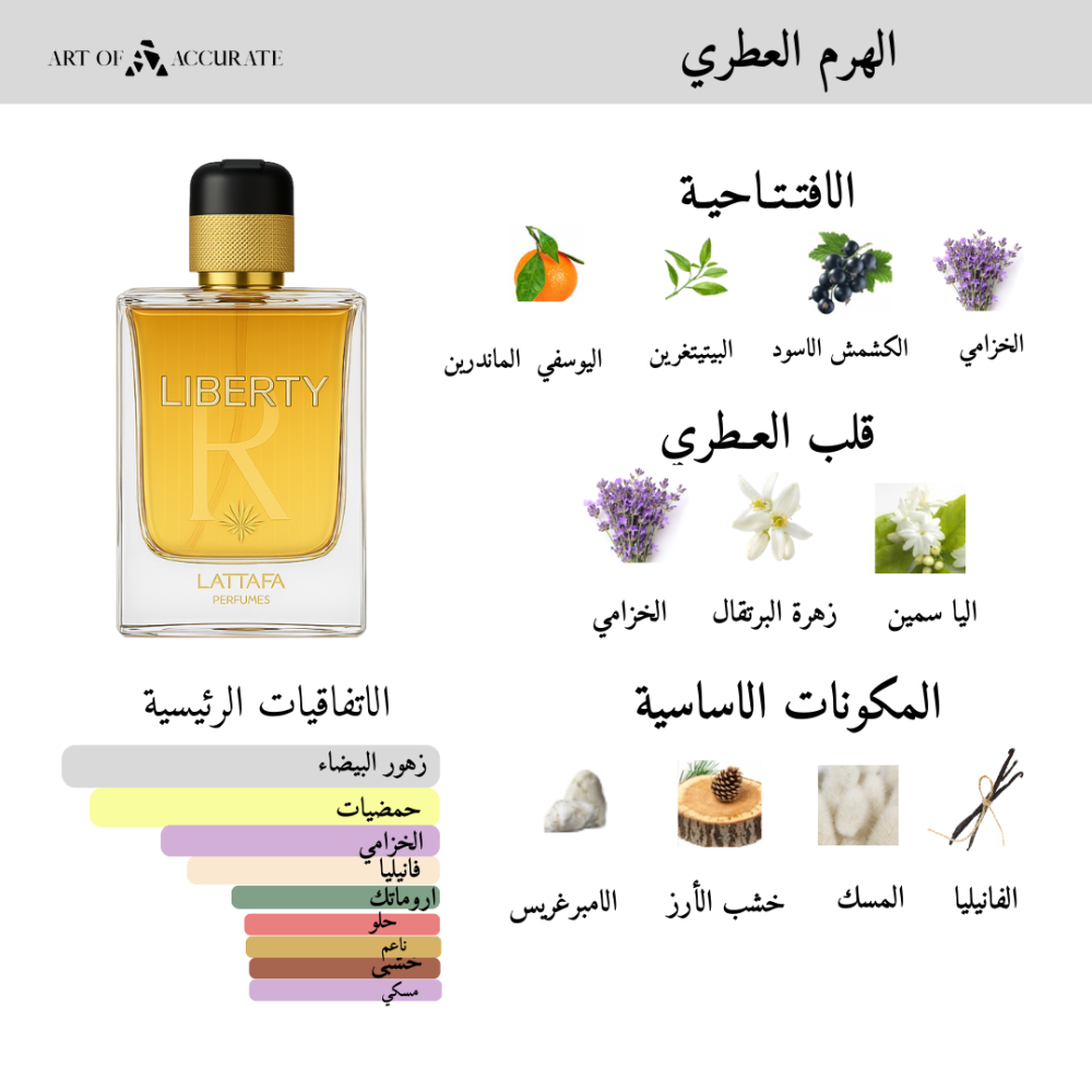 ينتمي LIBERTY عطر لعائلة العطور الأزهار وهي من أكثر المجموعات المحببة لدى الكثير، لكن عطر LIBERTY من أكثر العطور تميزًا في هذه المجموعة لأنه يأتي على غرار عطر ليبر من ايف سان لوران الأصلي بنفس المكونات والتركيزات ليعطينا نفس درجة الفوحان والثبات لكن بسعر تنافسي جدًا.